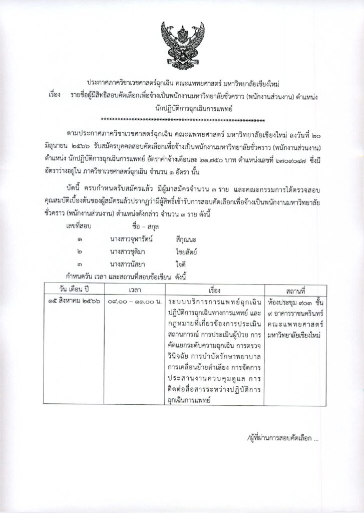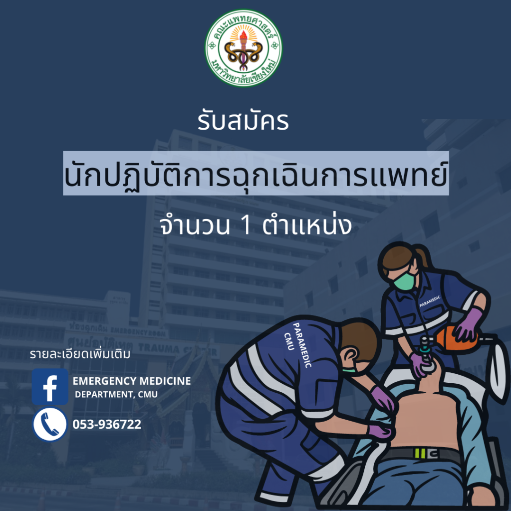 ตามประกาศภาควิชาเวชศาสตร์ฉุกเฉิน คณะแพทยศาสตร์ มหาวิทยาลัยเชียงใหม่ ลงวันที่ 20 มิถุนายน 2566 รับสมัครบุคคลสอบคัดเลือกเพื่อจ้างเป็นพนักงานมหาวิทยาลัยชั่วคราว (พนักงานส่วนงาน) ตำแหน่ง นักปฏิบัติการฉุกเฉินการแพทย์ อัตราค่าจ้างเดือนละ 21,750 บาท ตำแหน่งเลขที่ 6709047 ซึ่งมีอัตราว่างอยู่ใน ภาควิชาเวชศาสตร์ฉุกเฉิน จำนวน 1 อัตรา นั้น