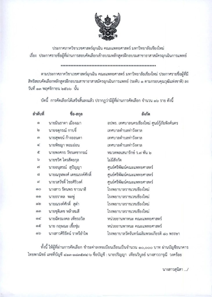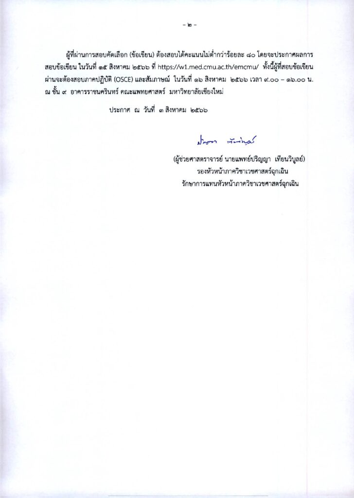 ผู้ที่ผ่านการสอบคัดเลือก (ข้อเขียน) ต้องสอบได้คะแนนไม่ต่ำกว่าร้อยละ 80 โดยจะประกาศผลการสอบข้อเขียน ในวันที่ 15 สิงหาคม 2566 ที่ https://emcmu.todsorb.dev/ ทั้งนี้ผู้ที่สอบข้อเขียนผ่านจะต้องสอบภาคปฏิบัติ (OSCE) และสัมภาษณ์ ในวันที่ 16 สิงหาคม 2566 เวลา 9.00 – 16.00 น. ณ ชั้น 9 อาคารราชนครินทร์ คณะแพทยศาสตร์ มหาวิทยาลัยเชียงใหม่