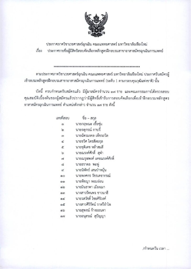 เรื่อง รายชื่อผู้มีสิทธิสอบคัดเลือกเพื่อจ้างเป็นพนักงานมหาวิทยาลัยชั่วคราว (พนักงานส่วนงาน) ตำแหน่ง นักปฏิบัติการฉุกเฉินการแพทย์