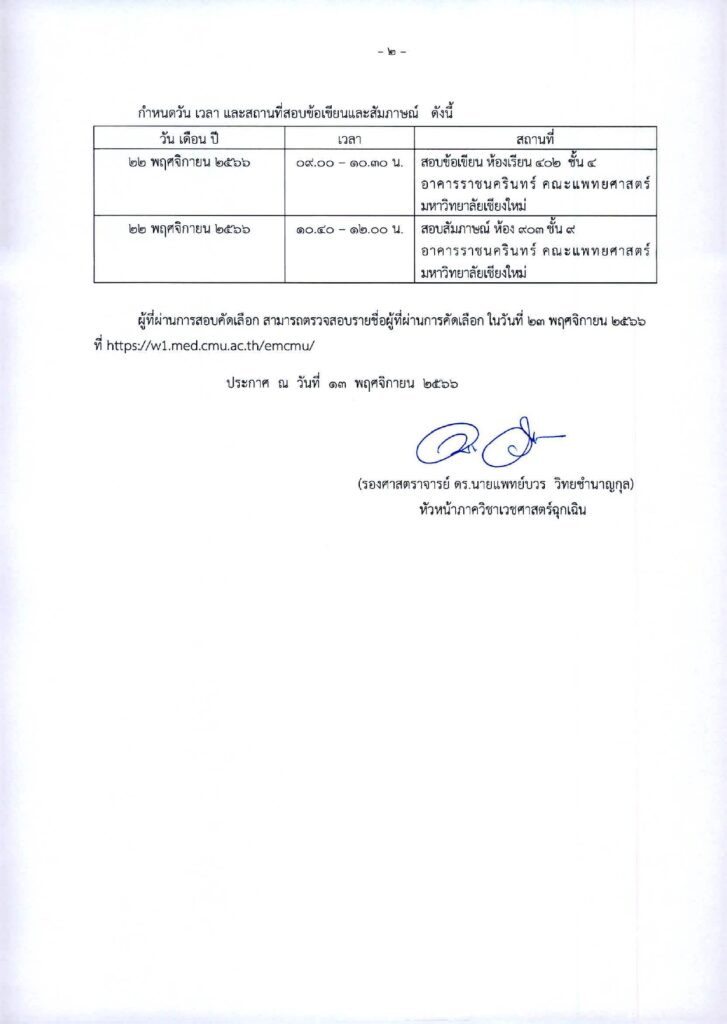 1.สอบข้อเขียน ห้อง 402 ชั้น 4 อาคารราชนครินทร์ คณะแพทยศาสตร์ มหาวิทยาลัยเชียงใหม่
